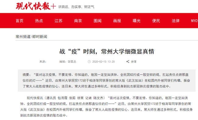现代快报讯(通讯员 包海霞 张茹 徐寅 记者 陆文杰)“面对这次疫情,不要发懵。你知道的,祖国一定坚如洪钟。全民团结拧成一股坚韧的绳,扛起责任点燃那盏信任的灯……”近日,由常州大学国贸172班于柏涛等同学原创的常大版《武汉加油》在校园内外被同学们传唱,振奋了常大人战胜疫情的信心。连日来,常大师生通过多种形式,积极投身到抗击新冠肺炎疫情的阻击战中。