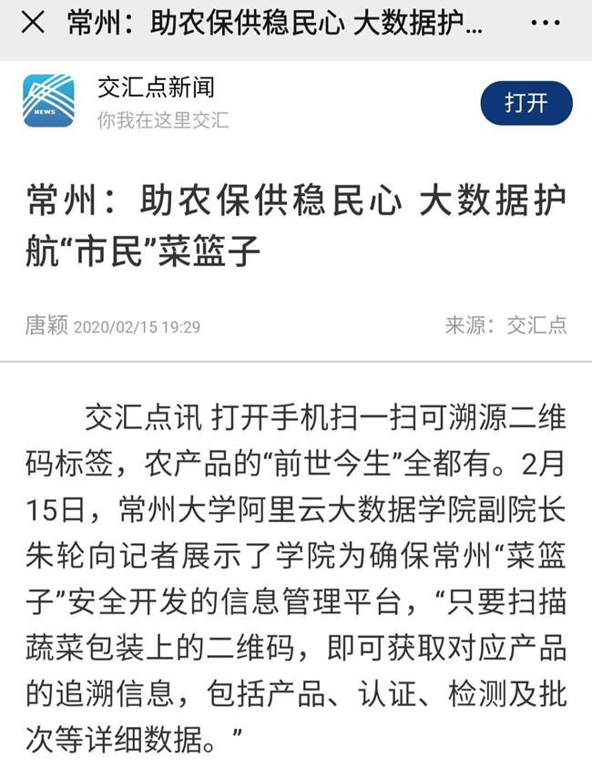 交汇点讯 打开手机扫一扫可溯源二维码标签,农产品的“前世今生”全都有。2月15日,常州大学阿里云大数据学院副院长朱轮向记者展示了学院为确保常州“菜篮子”安全开发的信息管理平台,“只要扫描蔬菜包装上的二维码,即可获取对应产品的追溯信息,包括产品、认证、检测及批次等详细数据。”