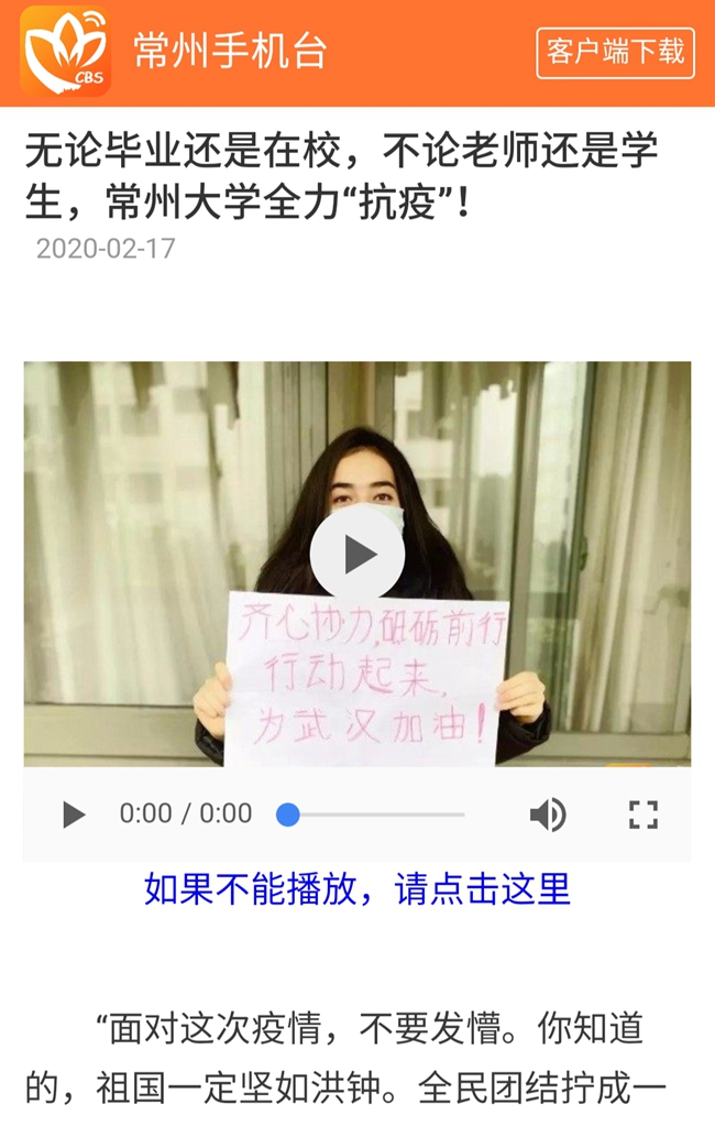 面对这次疫情,不要发懵。你知道的,祖国一定坚如洪钟。全民团结拧成一股坚韧的绳,扛起责任点燃那盏信任的灯……”近日,由常州大学国贸172班于柏涛等同学原创的常大版《武汉加油》在校园内外被同学们传唱,振奋了常大人,战胜疫情的信心。连日来,常州大学师生通过多种形式,积极投身到抗击新冠肺炎疫情的阻击战中。