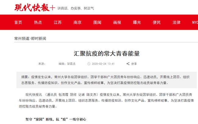 现代快报讯 (通讯员 包海霞 阴祥 记者 陆文杰)疫情发生以来,常州大学各级团学组织、团学干部和广大团员青年纷纷响应、迅速动员,开展线上团日、组织志愿服务、传播防疫知识、创作文化产品、宣传榜样故事,为坚决打赢疫情防控阻击战贡献青春力量。