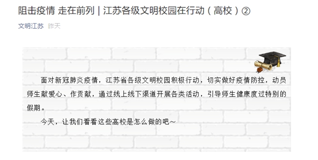 新冠肺炎疫情发生以来,常州大学坚守育人初心,心系战“疫”一线,老师学生齐参与,线上线下齐协调,前方后方齐发力,多措并举暖人心。一方面狠抓校园防控,守住校园底线,切实保障全校师生员工的生命安全和身体健康;另一方面服务社会防控,发挥专业特色,积极参与到社会疫情防控志愿服务活动中去。