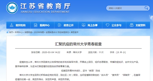 疫情发生以来,常州大学团委充分发挥党的助手和后备军作用,开展线上团日、组织志愿服务、传播防疫知识、创作文化产品、宣传榜样故事,为坚决打赢疫情防控阻击战贡献青春力量。
