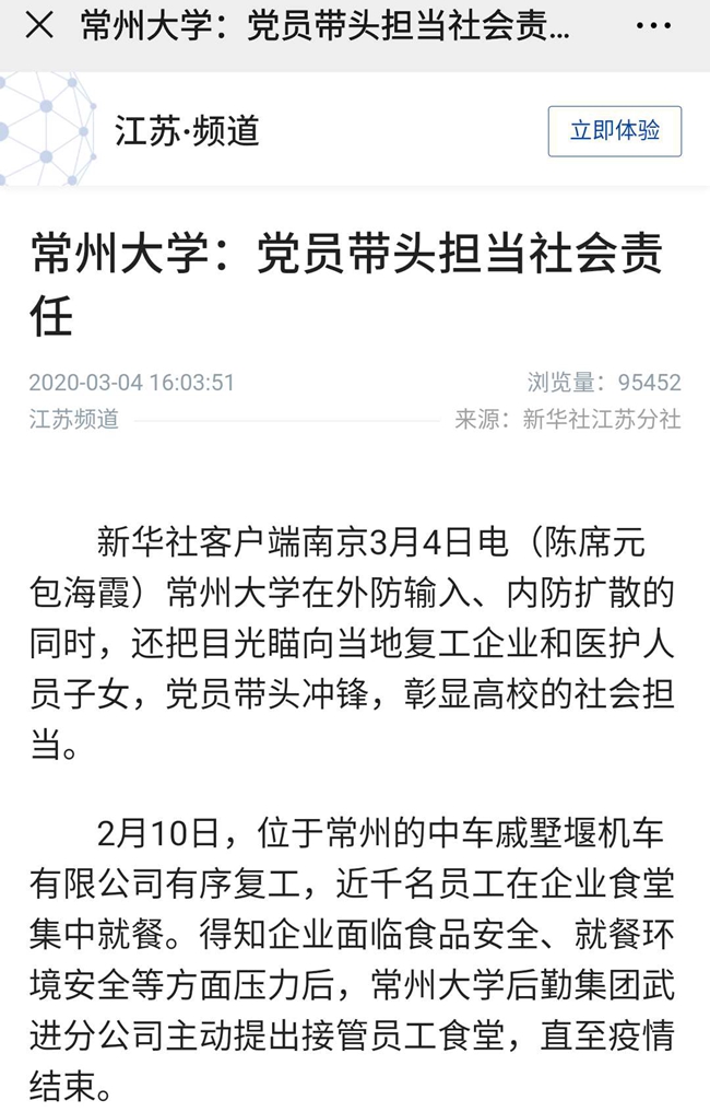 新华社客户端南京3月4日电(陈席元 包海霞)常州大学在外防输入、内防扩散的同时,还把目光瞄向当地复工企业和医护人员子女,党员带头冲锋,彰显高校的社会担当。