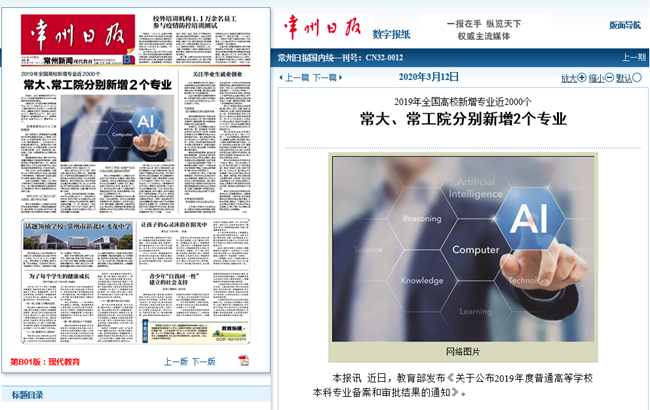 记者从在常高校了解到,今年,常州大学和常州工学院均新增人工智能备案专业。常工院还新增备案专业数据科学与大数据技术;常州大学新增审批专业消防工程。