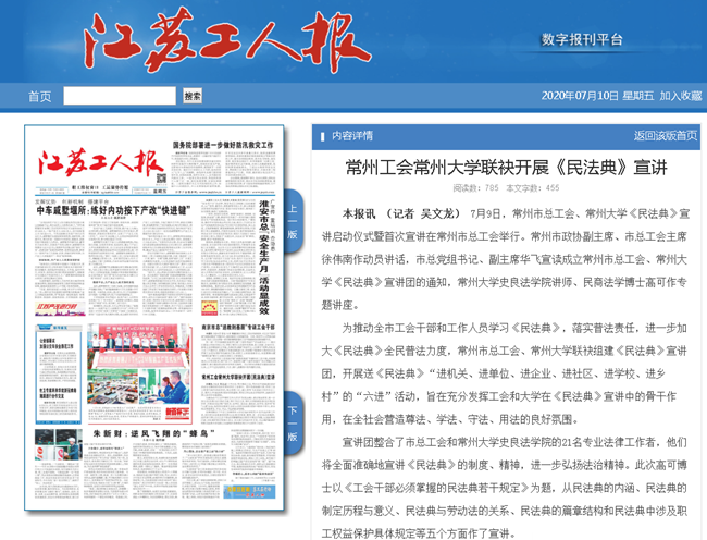 7月9日,常州市总工会、常州大学《民法典》宣讲启动仪式暨首次宣讲在常州市总工会举行。常州市政协副主席、市总工会主席徐伟南作动员讲话,市总党组书记、副主席华飞宣读成立常州市总工会、常州大学《民法典》宣讲团的通知,常州大学史良法学院讲师、民商法学博士高可作专题讲座。
