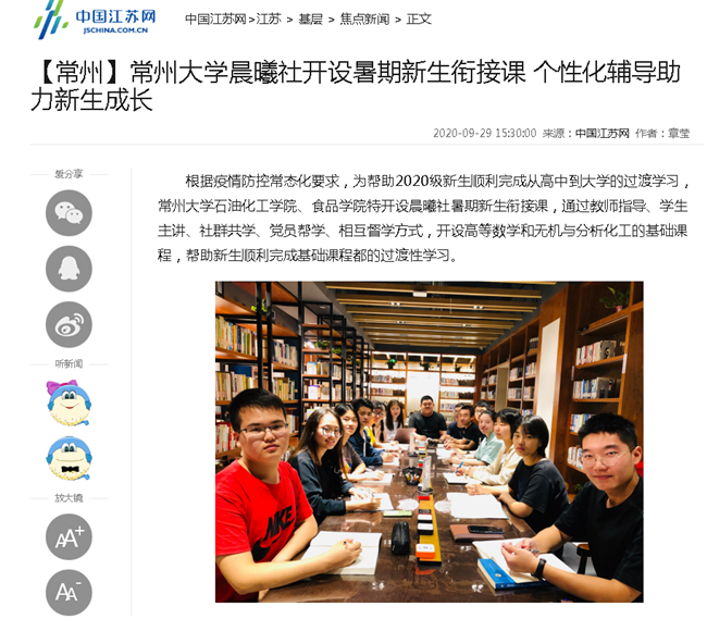 根据疫情防控常态化要求,为帮助2020级新生顺利完成从高中到大学的过渡学习,常州大学石油化工学院、食品学院特开设晨曦社暑期新生衔接课,通过教师指导、学生主讲、社群共学、党员帮学、相互督学方式,开设高等数学和无机与分析化工的基础课程,帮助新生顺利完成基础课程都的过渡性学习。