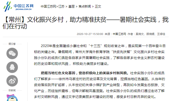 2020年是全面建成小康社会和“十三五”规划收官之年,是实现第一个百年奋斗目标的关键之年。暑假期间,常州大学海外教育学院“扶贫先扶智”文化振兴乡村社会实践小分队的成员们奔赴各自家乡开展暑期社会实践,了解各自家乡社会主义新农村建设的历史沿革和现状风貌, 积极助力美丽乡村建设。