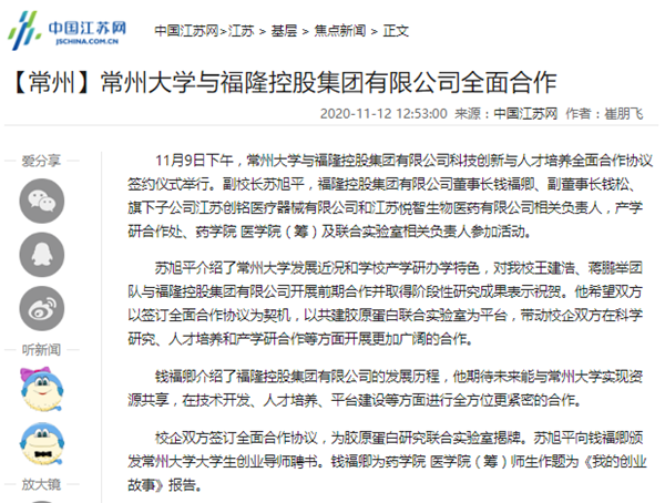 苏旭平介绍了常州大学发展近况和学校产学研办学特色,对我校王建浩、蒋鹏举团队与福隆控股集团有限公司开展前期合作并取得阶段性研究成果表示祝贺。他希望双方以签订全面合作协议为契机,以共建胶原蛋白联合实验室为平台,带动校企双方在科学研究、人才培养和产学研合作等方面开展更加广阔的合作。