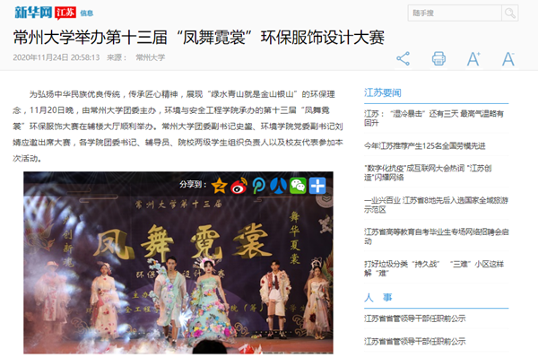 为弘扬中华民族优良传统,传承匠心精神,展现“绿水青山就是金山银山”的环保理念,11月20日晚,由常州大学团委主办,环境与安全工程学院承办的第十三届“凤舞霓裳”环保服饰大赛在辅楼大厅顺利举办。常州大学团委副书记史鋆、环境学院党委副书记刘婧应邀出席大赛,各学院团委书记、辅导员、院校两级学生组织负责人以及校友代表参加本次活动。