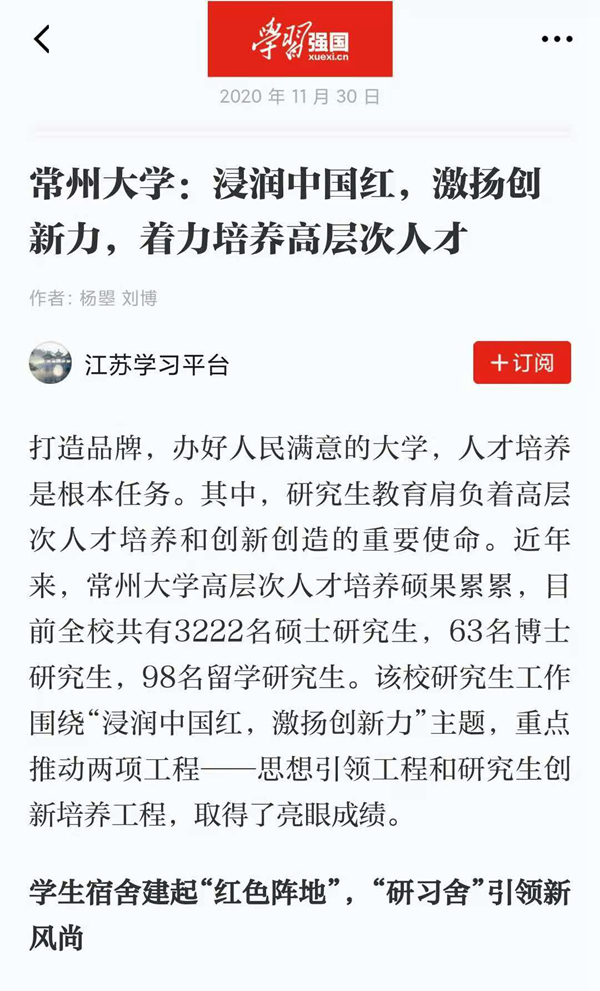 打造品牌,办好人民满意的大学,人才培养是根本任务。其中,研究生教育肩负着高层次人才培养和创新创造的重要使命。近年来,常州大学高层次人才培养硕果累累,目前全校共有3222名硕士研究生,63名博士研究生,98名留学研究生。该校研究生工作围绕“浸润中国红,激扬创新力”主题,重点推动两项工程——思想引领工程和研究生创新培养工程,取得了亮眼成绩。