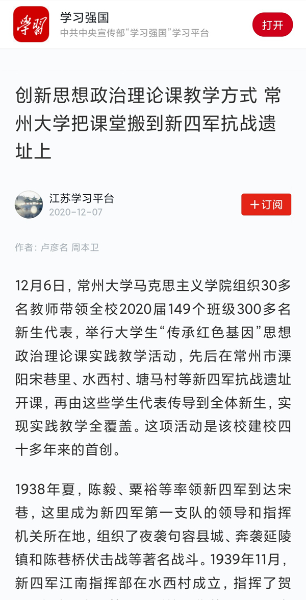 12月6日,常州大学马克思主义学院组织30多名教师带领全校2020届149个班级300多名新生代表,举行大学生“传承红色基因”思想政治理论课实践教学活动,先后在常州市溧阳宋巷里、水西村、塘马村等新四军抗战遗址开课,再由这些学生代表传导到全体新生,实现实践教学全覆盖。这项活动是该校建校四十多年来的首创。