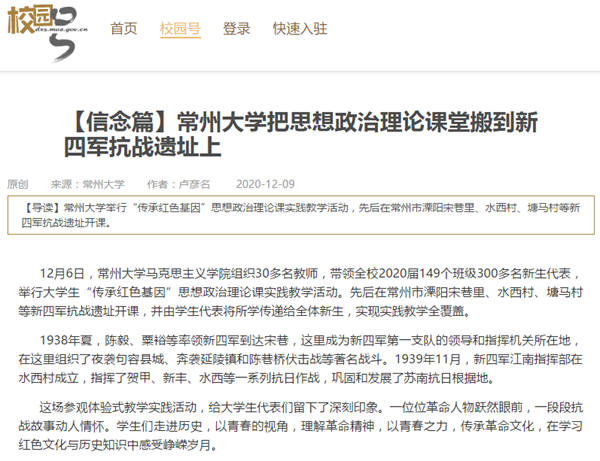 12月6日,常州大学马克思主义学院组织30多名教师,带领全校2020届149个班级300多名新生代表,举行大学生“传承红色基因”思想政治理论课实践教学活动。先后在常州市溧阳宋巷里、水西村、塘马村等新四军抗战遗址开课,并由学生代表将所学传递给全体新生,实现实践教学全覆盖。