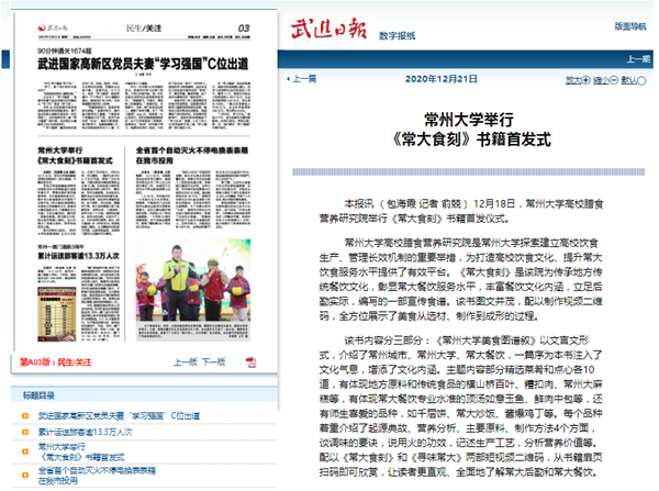12月18日,常州大学高校膳食营养研究院举行《常大食刻》书籍首发仪式。
