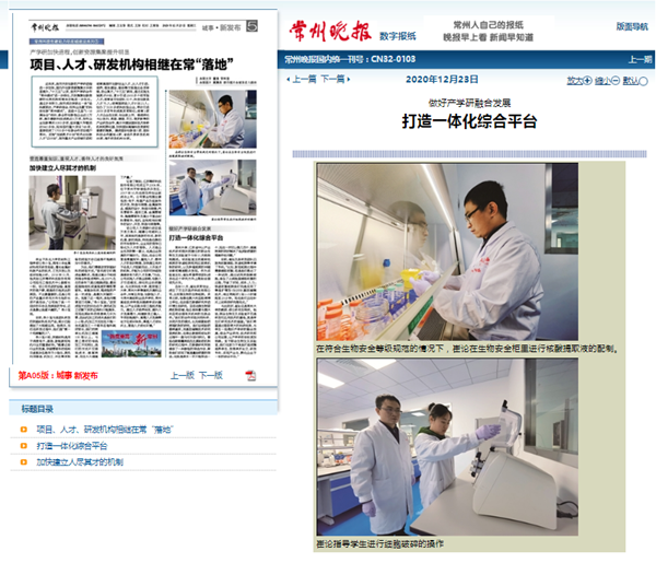 与此同时,崔论还是常州大学的教授、硕士研究生导师。他说,联合生物交叉实验室不仅是研发可应用技术的基地,更是学生们研究技术的摇篮。“我们希望通过借助常大的科研优势,与学生一起做好产学研的融合发展,结合产业研究、技术研究和公司运营,让产学研的目标更加明确。至于联合生物交叉实验室,我们也致力于将其打造成集培养学生、发表学术论文、研发专利、实现产业化、孵化企业于一体的综合平台。”