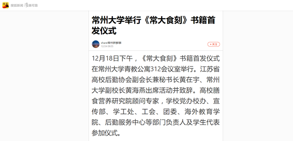 12月18日下午,《常大食刻》书籍首发仪式在常州大学青教公寓312会议室举行。江苏省高校后勤协会副会长兼秘书长黄在宇、常州大学副校长黄海燕出席活动并致辞。高校膳食营养研究院顾问专家,学校党办校办、宣传部、学工处、工会、团委、海外教育学院、后勤服务中心等部门负责人及学生代表参加仪式。