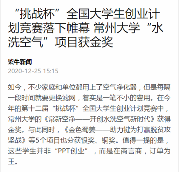 如今,不少家庭和单位都用上了空气净化器,但是每隔一段时间就要更换滤网,着实是一笔不小的费用。在今年的第十二届“挑战杯”全国大学生创业计划竞赛中,常州大学的《常新空净——开创水洗空气新时代》获得金奖。与此同时,《金色蜀姜——助力犍为打赢脱贫攻坚战》等5个项目也分获银奖、铜奖。值得一提的是,这些学生并非“PPT创业”,而是在商言商,订单为王。
