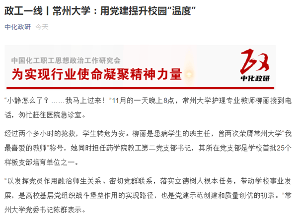 经过两个多小时的抢救,学生转危为安。柳丽是患病学生的班主任,曾两次荣膺常州大学“我最喜爱的教师”称号,她同时担任药学院教工第二党支部书记,其所在党支部是学校首批25个样板支部培育单位之一。