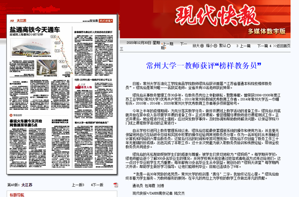 日前,常州大学石油化工学院食品学院教师缪凤仙获评首届“江苏省普通本科院校榜样教务员”。缪凤仙是常州唯一一名获奖老师,全省共有10名老师获此殊荣。