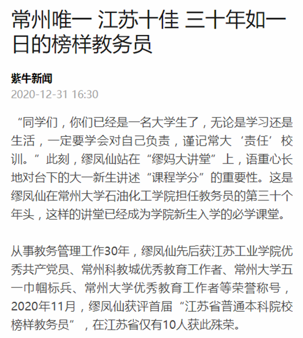 从事教务管理工作30年,缪凤仙先后获江苏工业学院优秀共产党员、常州科教城优秀教育工作者、常州大学五一巾帼标兵、常州大学优秀教育工作者等荣誉称号,2020年11月,缪凤仙获评首届“江苏省普通本科院校榜样教务员”,在江苏省仅有10人获此殊荣。