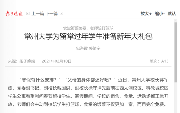 为了让留校学生在校园安心过好寒假,常州大学对留校学生进行“一人一档”备案,每日进行健康打卡监测,精准掌握学生健康状况。同时,学校安排老师值班和24小时在线服务反馈,还将举办系列活动来丰富学生寒假活动。