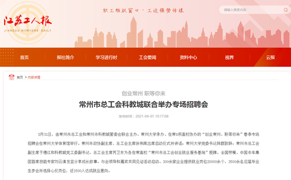 3月31日,由常州市总工会和常州市科教城管委会联合主办、常州大学承办、在常8所高校协办的“创业常州、职等你来”春季专场招聘会在常州大学体育馆举行。常州市政协副主席、总工会主席徐伟南出席启动仪式并讲话;常州大学党委书记陈群致辞;常州市总工会副主席于德江和科教城党工委副书记、总工会主席芮卫东为各在常高校“常州市总工会创业就业服务基地”授牌。全国劳模、中国中车集团首席技能专家刘云清发言分享成长故事。与会领导和嘉宾共同见证活动启动。300余家企业提供就业岗位20000余个,3500余名应届毕业生参会并选择心仪岗位,近1500人达成就业意向。