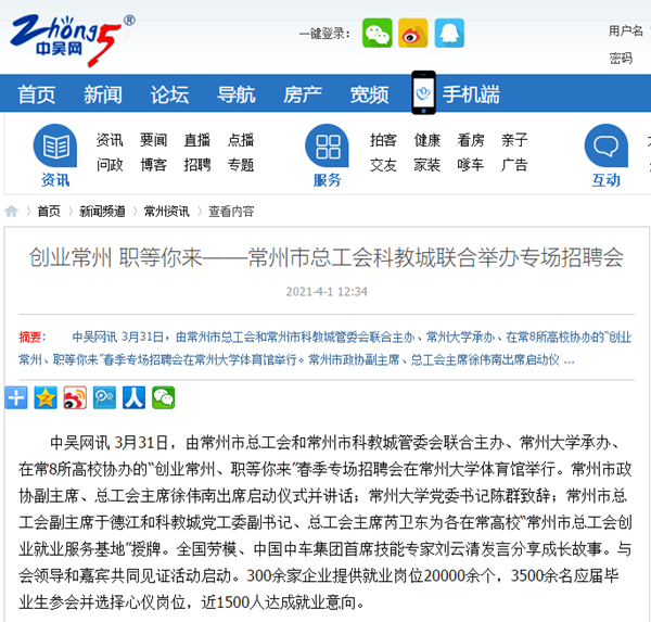 3月31日,由常州市总工会和常州市科教城管委会联合主办、常州大学承办、在常8所高校协办的“创业常州、职等你来”春季专场招聘会在常州大学体育馆举行。常州市政协副主席、总工会主席徐伟南出席启动仪式并讲话;常州大学党委书记陈群致辞;常州市总工会副主席于德江和科教城党工委副书记、总工会主席芮卫东为各在常高校“常州市总工会创业就业服务基地”授牌。全国劳模、中国中车集团首席技能专家刘云清发言分享成长故事。与会领导和嘉宾共同见证活动启动。300余家企业提供就业岗位20000余个,3500余名应届毕业生参会并选择心仪岗位,近1500人达成就业意向。