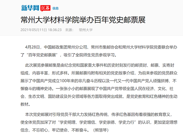 4月28日,中国邮政集团常州分公司、常州市集邮协会和常州大学材料学院党委联合举办了“百年党史邮票展”,吸引了全院师生党员参观学习。