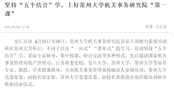 4月25日至30日,常州大学机关事务研究院首届干部能力素质培训班在常州大学举行。不同于以往“一站式”“菜单式”的学习,培训坚持“五个结合”学,采取专家辅导、集中授课、研讨交流等多种形式,先后邀请国家机关事务管理局资产管理司、江苏省委党校、复旦大学、苏州大学、常州大学等知名专家、教授、学者授课指导。全市机关事务管理系统80余人参加培训。常州大学党委常委、副校长张宏如,常州大学党委常委、副校长黄海燕分别莅临培训班开班和结业仪式。