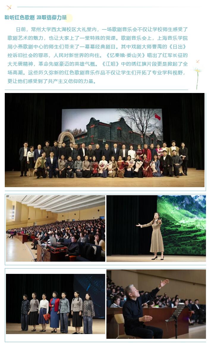 日前,常州大学西太湖校区大礼堂内,一场歌剧音乐会不仅让学校师生感受了歌剧艺术的魅力,也让大家上了一堂特殊的党课。歌剧音乐会上,上海音乐学院周小燕歌剧中心的师生们带来了一幕幕经典剧目。其中戏剧大师曹禺的《日出》控诉旧社会的罪恶,人民对新世界的向往。《忆秦娥·娄山关》唱出了红军长征的大无畏精神,革命先驱豪迈的英雄气概。《江姐》中的绣红旗片段更是掀起了全场高潮。这些历久弥新的红色歌剧音乐作品不仅让学生们开拓了专业学科视野,更让他们感受到了共产主义信仰的力量。