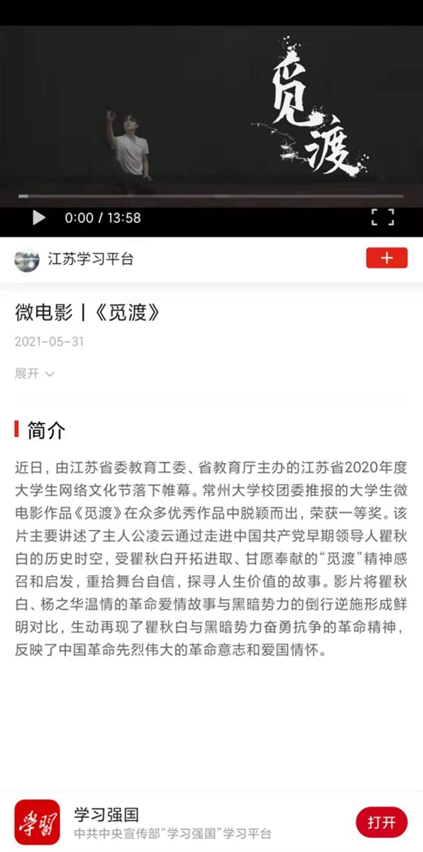 近日,由江苏省委教育工委、省教育厅主办的江苏省2020年度大学生网络文化节落下帷幕。常州大学校团委推报的大学生微电影作品《觅渡》在众多优秀作品中脱颖而出,荣获一等奖。该片主要讲述了主人公凌云通过走进中国共产党早期领导人瞿秋白的历史时空,受瞿秋白开拓进取、甘愿奉献的“觅渡”精神感召和启发,重拾舞台自信,探寻人生价值的故事。影片将瞿秋白、杨之华温情的革命爱情故事与黑暗势力的倒行逆施形成鲜明对比,生动再现了瞿秋白与黑暗势力奋勇抗争的革命精神,反映了中国革命先烈伟大的革命意志和爱国情怀。