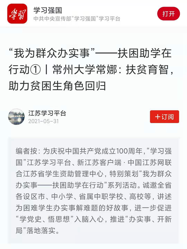 学习强国:“我为群众办实事”——扶困助学在行动①丨常州大学常娜:扶贫育智,助力贫困生角色回归
