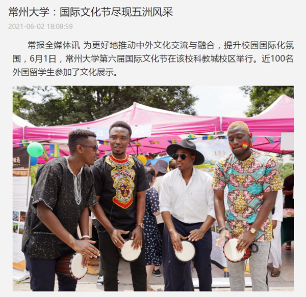为更好地推动中外文化交流与融合,提升校园国际化氛围,6月1日,常州大学第六届国际文化节在该校科教城校区举行。近100名外国留学生参加了文化展示。