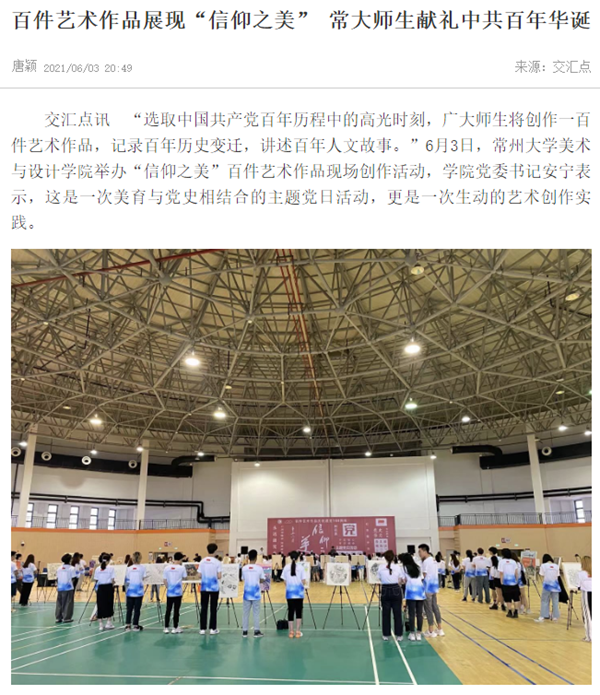 “选取中国共产党百年历程中的高光时刻,广大师生将创作一百件艺术作品,记录百年历史变迁,讲述百年人文故事。”6月3日,常州大学美术与设计学院举办“信仰之美”百件艺术作品现场创作活动,学院党委书记安宁表示,这是一次美育与党史相结合的主题党日活动,更是一次生动的艺术创作实践。