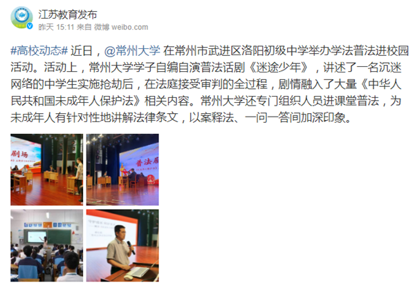 江苏教育发布(微博):常州大学在常州市武进区洛阳初级中学举办学法普法进校园活动