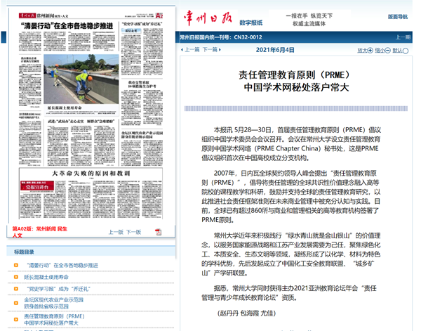 5月28—30日,首届责任管理教育原则(PRME)倡议组织中国学术委员会会议召开。会议在常州大学设立责任管理教育原则中国学术网络(PRME Chapter China)秘书处,这是PRME倡议组织首次在中国高校成立分支机构。