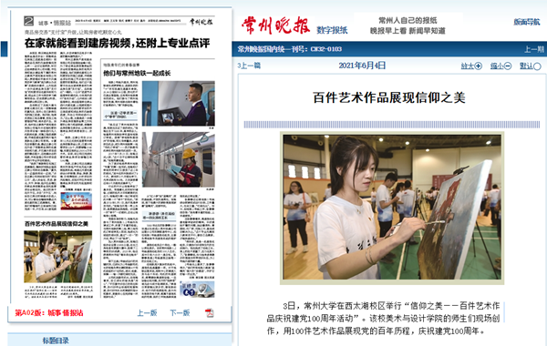 3日,常州大学在西太湖校区举行“信仰之美——百件艺术作品庆祝建党100周年活动”。该校美术与设计学院的师生们现场创作,用100件艺术作品展现党的百年历程,庆祝建党100周年。