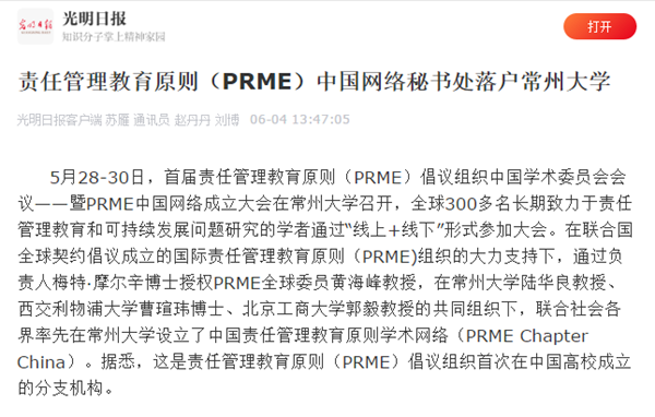 5月28-30日,首届责任管理教育原则(PRME)倡议组织中国学术委员会会议——暨PRME中国网络成立大会在常州大学召开,全球300多名长期致力于责任管理教育和可持续发展问题研究的学者通过“线上+线下”形式参加大会。在联合国全球契约倡议成立的国际责任管理教育原则(PRME)组织的大力支持下,通过负责人梅特·摩尔辛博士授权PRME全球委员黄海峰教授,在常州大学陆华良教授、西交利物浦大学曹瑄玮博士、北京工商大学郭毅教授的共同组织下,联合社会各界率先在常州大学设立了中国责任管理教育原则学术网络(PRME Chapter China)。据悉,这是责任管理教育原则(PRME)倡议组织首次在中国高校成立的分支机构。