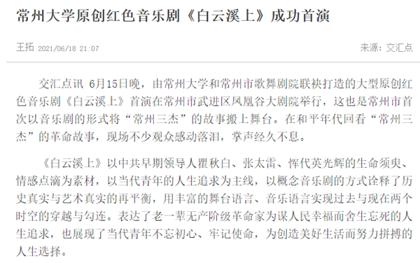 近年来,常州大学着力打造红色文化办学特色,陆续成立全国首家近现代史与红色文化研究院,建立全国首家红色文化资源大数据库,打造办“红刊”、编“红书”、建“红库”、立“红馆”、创“红社”、组“红联”、拓“红基”、筹“红培”、排“红剧”、塑“红像”等“十红”载体,开展全方位、多角度、立体化的科学研究与红色文化育人工程。《白云溪上》是常州大学和常州市歌舞剧院献礼建党100周年的精品力作,以原创红色剧目为载体,通过革命精神和红色文化对青年学生进行理想信念教育,深入推进“艺术+美育+思政”相融合的党史学习教育,着力赓续和传承红色基因,讲好红色故事,擦亮红色品牌,以优秀文艺精品推动红色基因融入城市血脉。