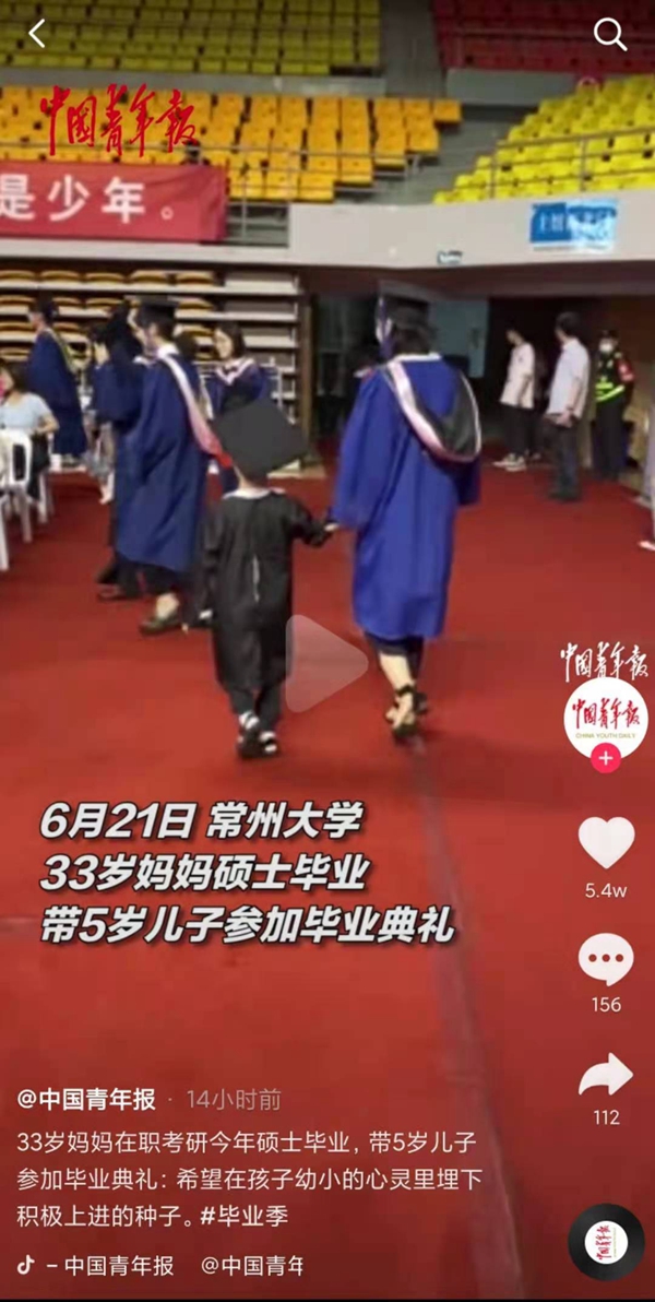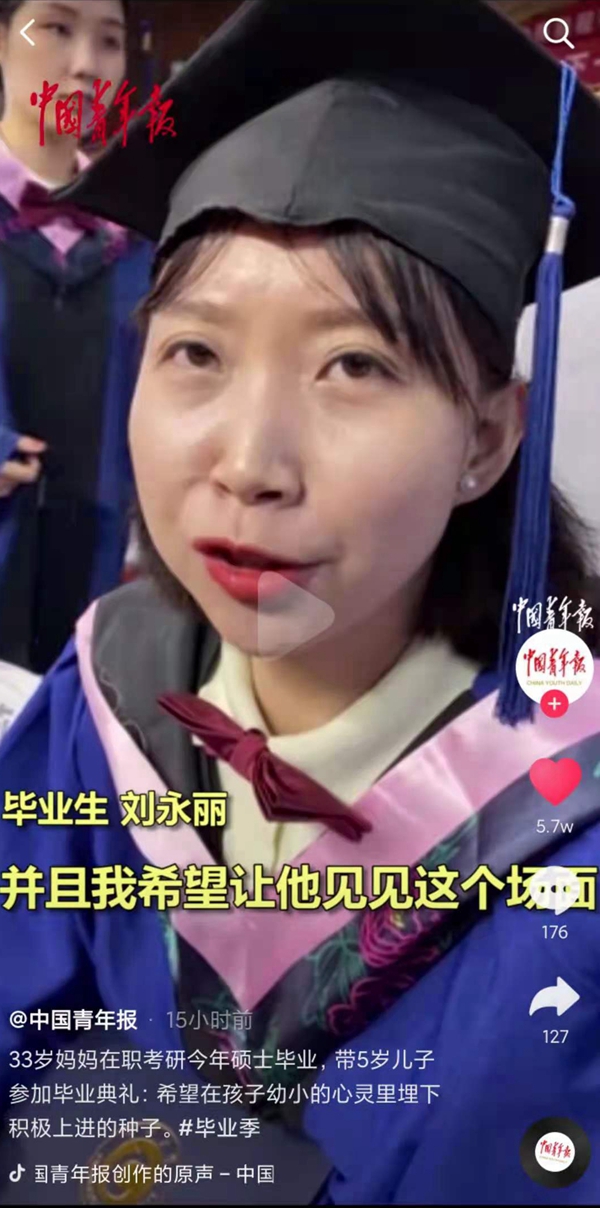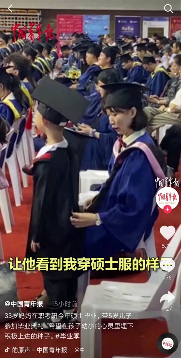 中国青年报抖音号:33岁妈妈在职考研今年硕士毕业,带5岁儿子参加毕业典礼