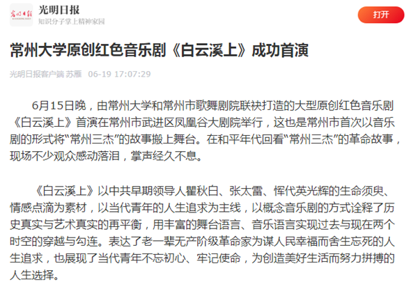 6月15日晚,由常州大学和常州市歌舞剧院联袂打造的大型原创红色音乐剧《白云溪上》首演在常州市武进区凤凰谷大剧院举行,这也是常州市首次以音乐剧的形式将“常州三杰”的故事搬上舞台。在和平年代回看“常州三杰”的革命故事,现场不少观众感动落泪,掌声经久不息。