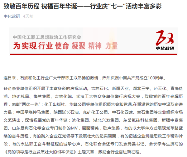 各企事业单位组织开展了丰富多彩的庆祝活动。吉林石化、新疆天业、湖北三宁、泸天化、青海盐湖、地矿总局、梅兰集团、吉林化院、武汉工大等众多单位举行庆祝大会,致敬党的百年光辉历程,表彰“两优一先”;化工出版社、华峰公司等单位组织报告会和党课,在重温党的历史中汲取奋进力量;中国平煤神马集团、陕西延长石油、兖矿化工公司、中石化四建、兰石集团等企业组织专场文艺演出,深情祝福党的百年华诞:滨化集团、湖北兴发集团、东岳氟硅科技集团、新疆中泰集团、山东垦利石化等企业专门制作的MV,画面精美,歌声悠扬,有的以大事件方式展现党荜路蓝缕的奋斗历程,有的融入企业在党领导下发展壮大的纪实画面,有的记述企业党建思政工作精彩片段,有的表达职工奋斗新征程的诚挚心声。石化联合会还专门发表党委书记、会长李寿生撰写的《党的领导是行业发展壮大的根本保证》主题文章,激励全行业奋进新征程。