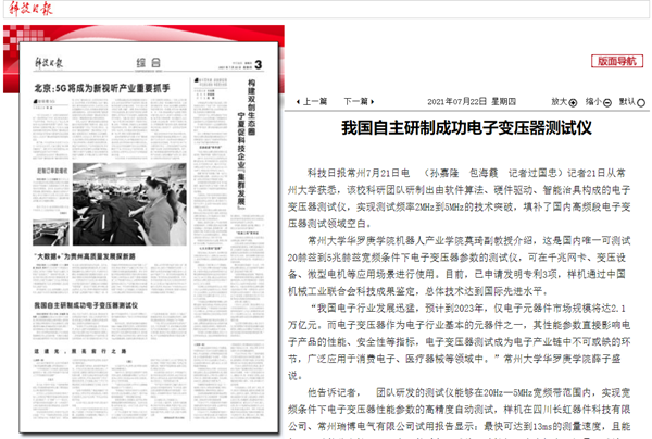记者21日从常州大学获悉,该校科研团队研制出由软件算法、硬件驱动、智能治具构成的电子变压器测试仪,实现测试频率2MHz到5MHz的技术突破,填补了国内高频段电子变压器测试领域空白。