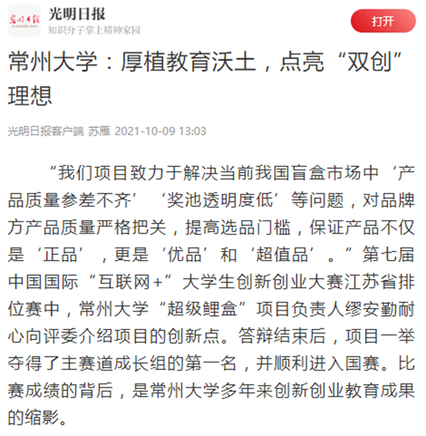 “我们项目致力于解决当前我国盲盒市场中‘产品质量参差不齐’‘奖池透明度低’等问题,对品牌方产品质量严格把关,提高选品门槛,保证产品不仅是‘正品’,更是‘优品’和‘超值品’。”第七届中国国际“互联网+”大学生创新创业大赛江苏省排位赛中,常州大学“超级鲤盒”项目负责人缪安勤耐心向评委介绍项目的创新点。答辩结束后,项目一举夺得了主赛道成长组的第一名,并顺利进入国赛。比赛成绩的背后,是常州大学多年来创新创业教育成果的缩影。