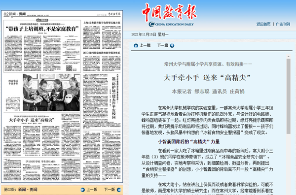 在常州大学机械学院的实验室里,一群常州大学附属小学三年级学生正屏气凝神地看着由3D打印机制作的机器外壳,与设计好的电路板、蜂鸣器组装在了一起。红灯亮提示肉类食品即将过期,绿灯亮提示蔬菜即将过期,黄灯亮提示奶制品即将过期,同时蜂鸣器发出了警报……孩子们惊喜地发现,头脑风暴中构想的“冰箱食物安全警报器”变成了现实。