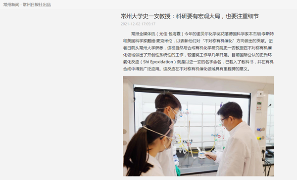 今年的诺贝尔化学奖花落德国科学家本杰明·李斯特和美国科学家戴维·麦克米伦,以表彰他们对“不对称有机催化”方向做出的贡献。记者日前从常州大学获悉,该校自然与合成有机化学研究院史一安教授在不对称有机催化领域做出了开创性系统性的工作,较诺奖工作早几年开展。目前国际公认的史氏环氧化反应(Shi Epoxidation)就是以史一安的名字命名,已载入了教科书,并在有机合成中得到广泛应用。该反应在不对称有机催化领域具有里程碑的意义。