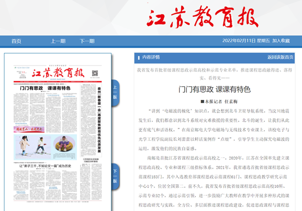 南邮是首批江苏省课程思政示范高校之一。2020年,江苏在全国率先建立课程思政高校、专业和课程三级指标体系。2021年,我省遴选首批省级课程思政示范课程183门,其中入选教育部课程思政示范课程61门、课程思政教学研究示范中心1个,位居全国第二。前不久,我省发布首批省级课程思政示范高校10所、示范专业52个,通过示范引领,进一步鼓励广大教师在教学中开展多种形式的课程思政研究与实践,全方位、多层面推进课程思政建设,促进思政课程与课程思政同向同行,逐步构建全面覆盖、类型丰富、层次递进、相互支撑的课程思政体系,健全“三全育人”大格局。