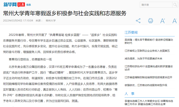2022年寒假,常州大学开展了“执青春画笔 绘家乡蓝图”——“返家乡”社会实践和志愿服务关爱行动,号召青年学生返乡后通过政企实践、公益服务、社区服务、兼职锻炼等社会实践形式,充分感受家乡变化、提升社会化技能、助力乡村振兴、投身文明实践、铭记党的奋斗历程,增强服务人民、回报家乡的责任感使命感。