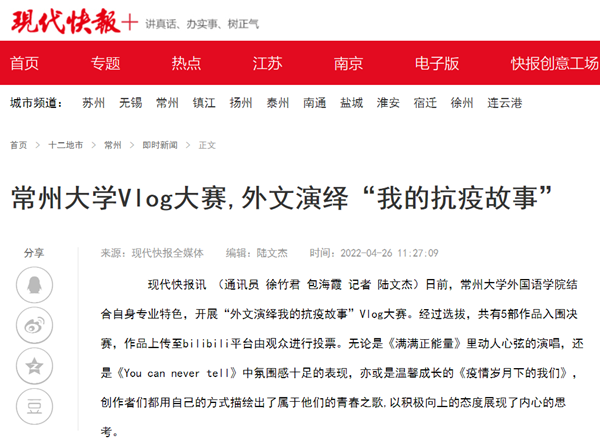 日前,常州大学外国语学院结合自身专业特色,开展“外文演绎我的抗疫故事”Vlog大赛。经过选拔,共有5部作品入围决赛,作品上传至bilibili平台由观众进行投票。无论是《满满正能量》里动人心弦的演唱,还是《You can never tell》中氛围感十足的表现,亦或是温馨成长的《疫情岁月下的我们》,创作者们都用自己的方式描绘出了属于他们的青春之歌,以积极向上的态度展现了内心的思考。