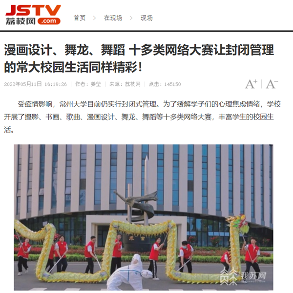 受疫情影响,常州大学目前仍实行封闭式管理。为了缓解学子们的心理焦虑情绪,学校开展了摄影、书画、歌曲、漫画设计、舞龙、舞蹈等十多类网络大赛,丰富学生的校园生活。