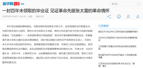 5月18日是国际博物馆日。为推动用好用活革命文物工作,由全国馆校合作联盟主办,中国文物交流中心指导,常州大学马克思主义学院、常州大学近现代史与红色文化研究院联袂推出“红色星期三——百家馆校革命文物周周讲”系列专栏第3期网络课程活动。本期邀请天津大学张太雷纪念室志愿讲解员、2021级法律硕士研究生尹卓扬担任主讲人,天津大学大学文化与校史研究所所长、高等教育研究所教授王傑,与常州三杰纪念馆原馆长、研究馆员黄明彦担任点评嘉宾。来自全国馆校合作联盟理事单位的常州大学、天津大学、北京交通大学、吉林大学、上海师范大学、山东聊城职业学院、南京渡江胜利纪念馆、常州三杰纪念馆等高校部分师生及博物馆人,通过线上的方式参加了此次活动。该活动由常州大学青年教师张雷主持。